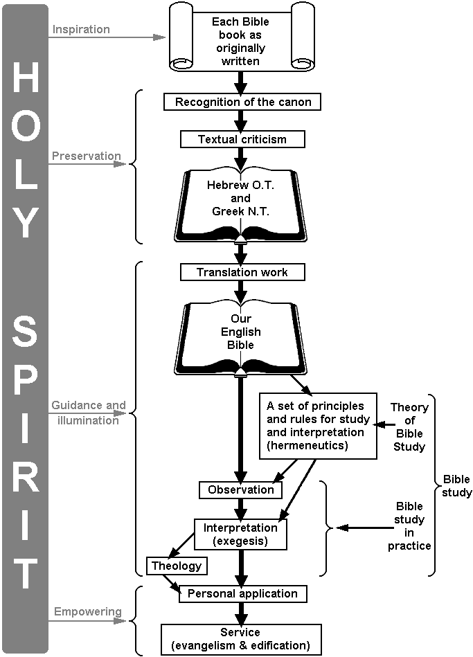 The theory of Bible study then becomes Bible study in actual practice as the person first observes what the biblical text says, then interprets it, and then integrates his interpretations into a systematic statement of the Bible's teachings known as theology. The Holy Spirit's ministry of illumination applies to each of these elements of Bible study.