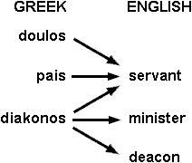 But your study is not complete yet, because each of the Greek words which is translated servant may have been translated into other English words in other passages. For example, diakonos is sometimes translated "minister" and sometimes "deacon." Again, your complete concordance will list the additional English words used to translate any given Greek word. You can find these additional occurrences of the Greek word by doing an original language search in your Bible software, or by looking up the additional English words in your complete concordance.