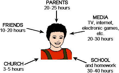 A school age child or teen is influenced from many sides during a typical week of his life. Each influence has its own unique impact in shaping the character and future of the individual. The numbers on the following diagram would vary greatly depending on the age of the child and the particular weekly pattern of the family.